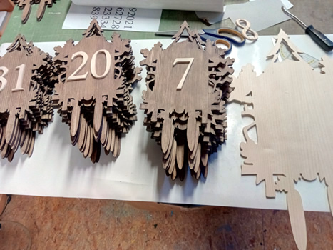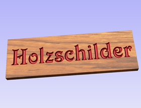 In Holz 3mm tief gefräst und mit Farbe ausgelegt.